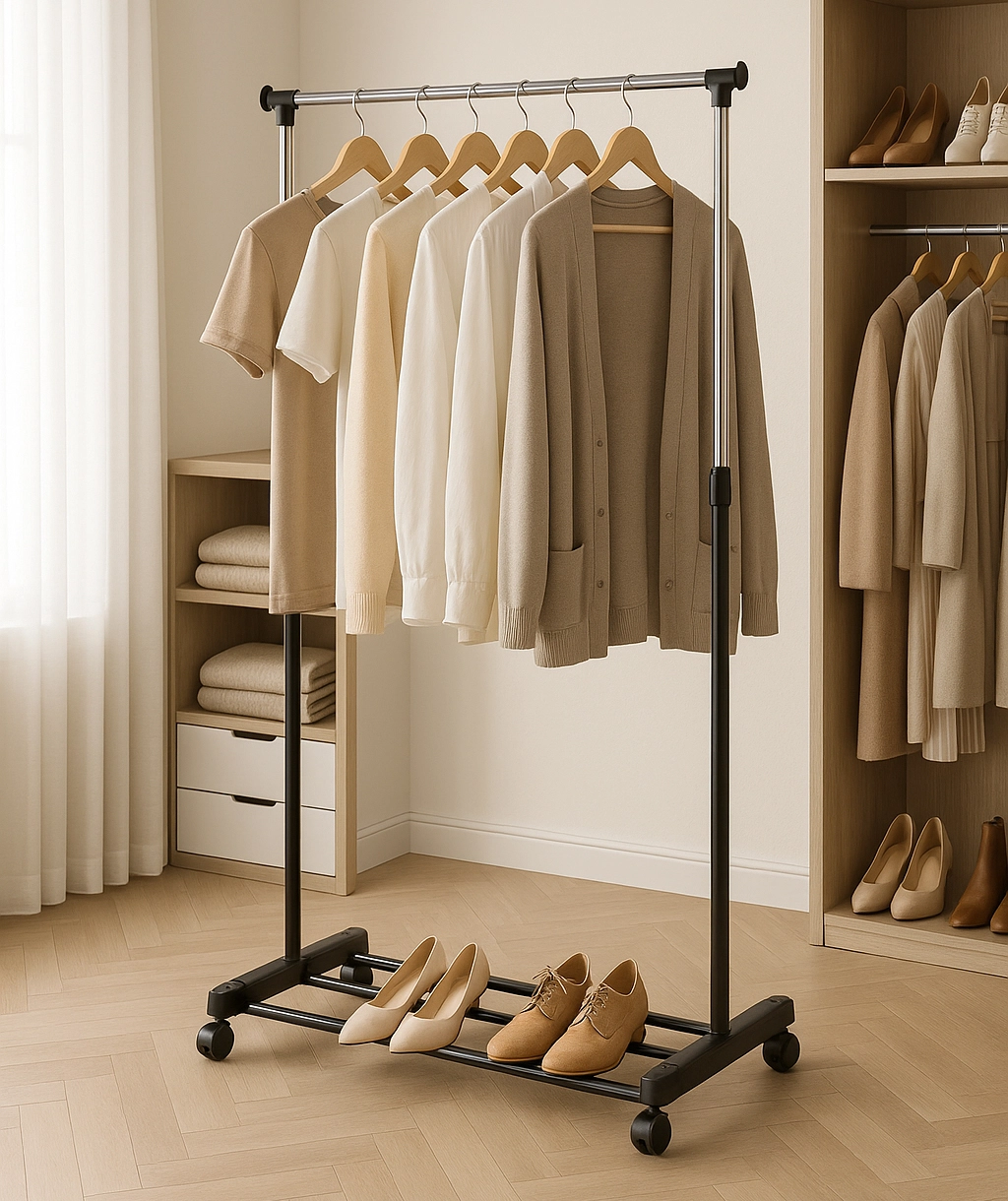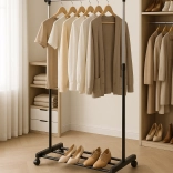 Samostoječe garderobno stojalo je praktičen način za shranjevanje oblačil in čevljev, kar ga naredi kot odličen dodatek za vsako garderobo, spalnico ali hodnik v vašem domu ali stanovanju. Zaradi univerzalnega oblikovanja se prilega tako modernim kot klasičnim interierjem, zato ne samo da nudi funkcionalnost, ampak tudi estetsko dopolnjuje vašo dekoracijo.