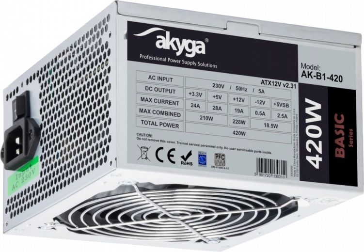 Napajalnik Akyga ATX je opremljen s tremi SATA priključki, dvema MOLEX priključkoma in univerzalnim 24-pin priključkom za osnovne plošče. Podpira specifikacijo ATX12V 2.0, kar omogoča njegovo uporabo s platformami nove generacije. Vgrajen ventilator s premerom 12 cm zagotavlja učinkovito hlajenje in tiho delovanje.