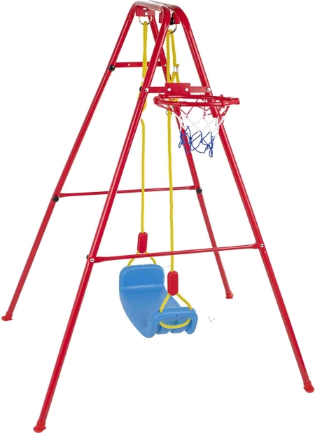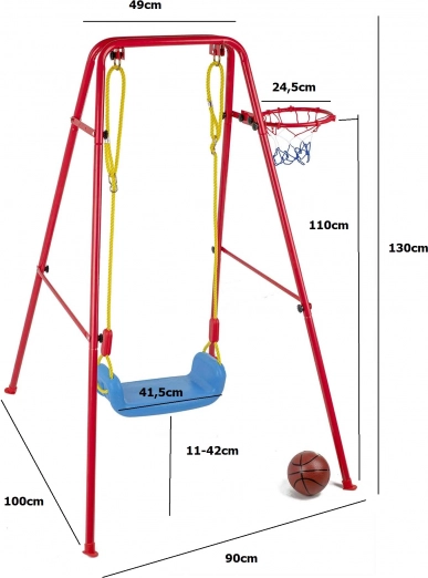 Ta vsestranska vrtna gugalnica združuje priljubljeno guganje s košarkarsko zabavo. Stabilno kovinsko ogrodje s premerom cevi približno 2,5 cm in močna vrv držita širok plastičen sedež (pribl. 43 × 25,5 cm) za udobno in varno uporabo. Del kompleta je košarkarski koš, ki ga je mogoče preprosto pritrditi na ogrodje, ter tudi mini žoga in tlačilka za takojšnjo igro.