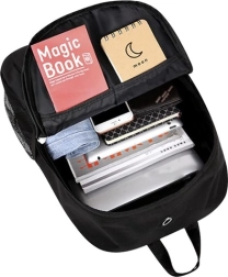 Eleganten črn nahrbtnik iz trpežne tkanine Oxford je vodoodporen in je zaradi oblazinjenega hrbtišča ter naramnic z mrežico MESH udoben za nošenje ves dan. Svetleč reflektivni potisk poveča vašo vidnost v mraku in temi, zato je odlična izbira za šolarje, za v mesto in za izlete.