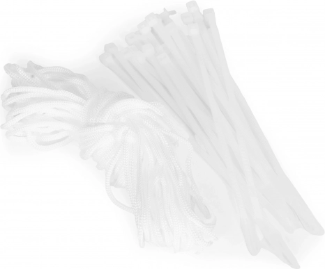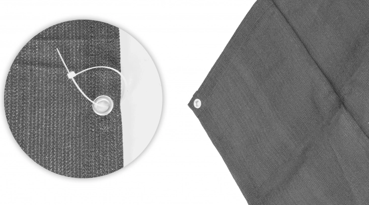 Del paketa so aluminijasta očesa, nameščena približno vsakih 40 cm ob robovih, kar zagotavlja stabilno in trajno pritrditev na ograjo. Zaradi odpornosti na korozijo ostajajo funkcionalna in estetska tudi po dolgotrajni zunanji uporabi. Montažni komplet vsebuje 26 zadrgov in 2 osmometrski vrvi za hitro namestitev na obe strani ograje. Fleksibilna konstrukcija omogoča enostavno prilagoditev različnim balkonom in terasam.