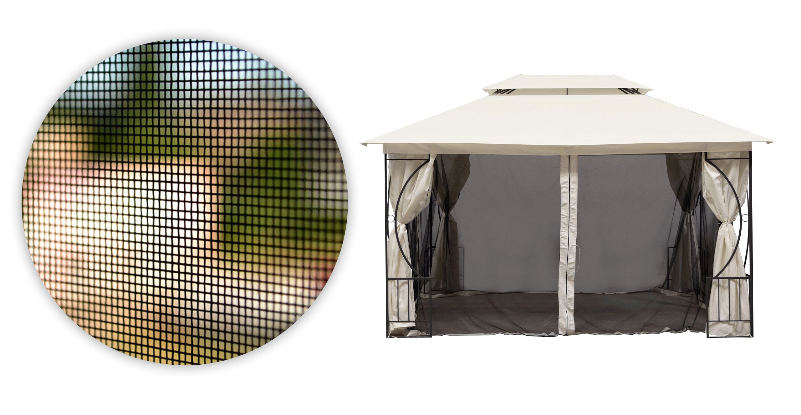 Izdelana iz odpornih poliestrskih vlaken, ta mreža je znana po odpornosti na vremenske vplive. Učinkovito blokira komarje, muhe in druge žuželke ter tako ustvari zaščitno pregrado, pri tem pa ohranja vaš stik z naravo. Njena mrežasta struktura ne ovira naravne svetlobe niti kroženja zraka, zato paviljon ostane svetel, zračen in udoben tudi v vročih dneh.