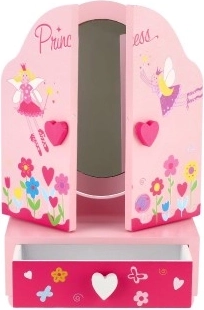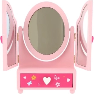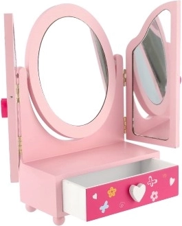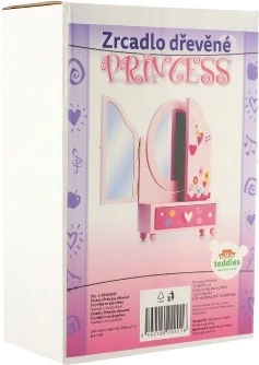 Prisrčno otroško toaletno ogledalo s škatlico za nakit v motivu PRINCESS bo razveselilo vsako malo damo. Trikrilo ogledalo s stranskimi deli za boljši pregled, praktičen predalček za zaklade in čvrsta lesena izdelava v nežni rožnati barvi. Idealno za shranjevanje prstančkov, zapestnic in kroglic ter za spodbudo ustvarjalne igre.