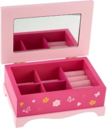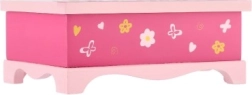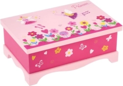 Ta rožnata lesena škatlica za nakit Princess združuje čaroben videz s praktično razdelitvijo. Zahvaljujoč zrcalcu na notranji strani pokrova in petim premišljeno zasnovanim predalčkom pomaga ohranjati nakit in drobnarije lepo urejene. Nežna cvetlična dekoracija in napis Princess ustvarjata pravljično vzdušje, ki se odlično poda v otroško sobo.