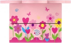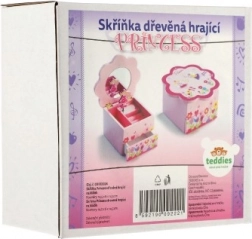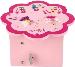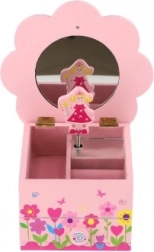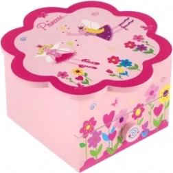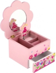 Očarljiva lesena škatlica za nakit v rožnati barvi bo razveselila vsako malo ljubiteljico pravljic. Pokrov v obliki cveta skriva ogledalce, ob odprtju pa se sproži glasbeni mehanizem, ki vsako krasitev spremeni v čaroben ritual. Notranja razporeditev s predalčki in spodnji predal pomagata ohranjati red med prstančki, zapestnicami, kroglicami in drobnimi zakladi.