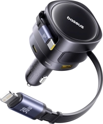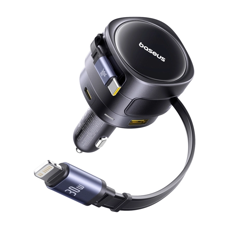 Polnilec za avto Baseus ponuja možnost polnjenja štirih naprav hkrati zaradi dveh vgrajenih kablov (USB-C in Lightning) skupaj z dvema dodatnima vratoma (USB-C in USB-A).