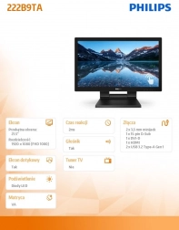 Philips monitor z diagonalo 21,5 palcev je opremljen s tehnologijo na dotik, ki omogoča 10-točkovni multitouch, kar je idealno za uporabo v interaktivnih aplikacijah. Zahvaljujoč uporabljenemu VA panelu ponuja monitor ostre detajle in široke kote gledanja, kar zagotavlja odlično izkušnjo z vsakega zornega kota.