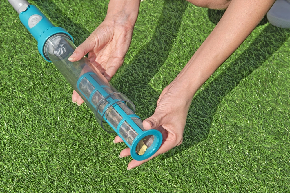 Brezžični bazenski sesalnik Bestway AquaSurge prihrani čas in trud. Zahvaljujoč prozorni zbiralni komori prostornine 0,54 l takoj vidite zbrane nečistoče, fin filter pa ujame listje, pesek in drobne usedline. Trisegmentna teleskopska aluminijasta palica omogoča udoben doseg po celotni površini bazena ter enostavno manevriranje ob stenah in v kotih.