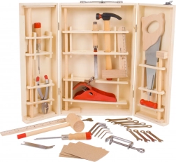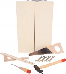Podarite svojemu otroku veselje do ustvarjanja s tem praktičnim orodnim kovčkom. Vsak kos orodja je skrbno izdelan iz kakovostnega lesa in kovine, da prenese raziskovalne roke malega mojstra.
