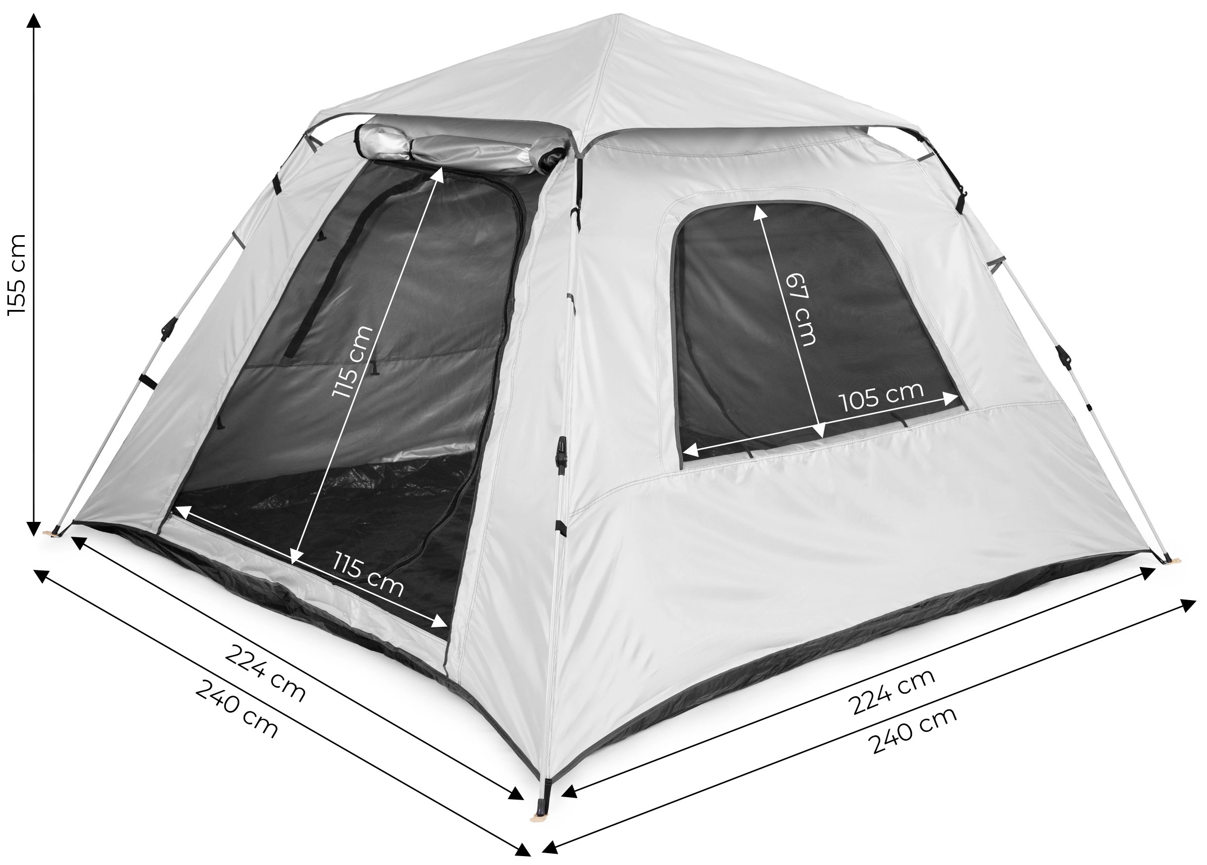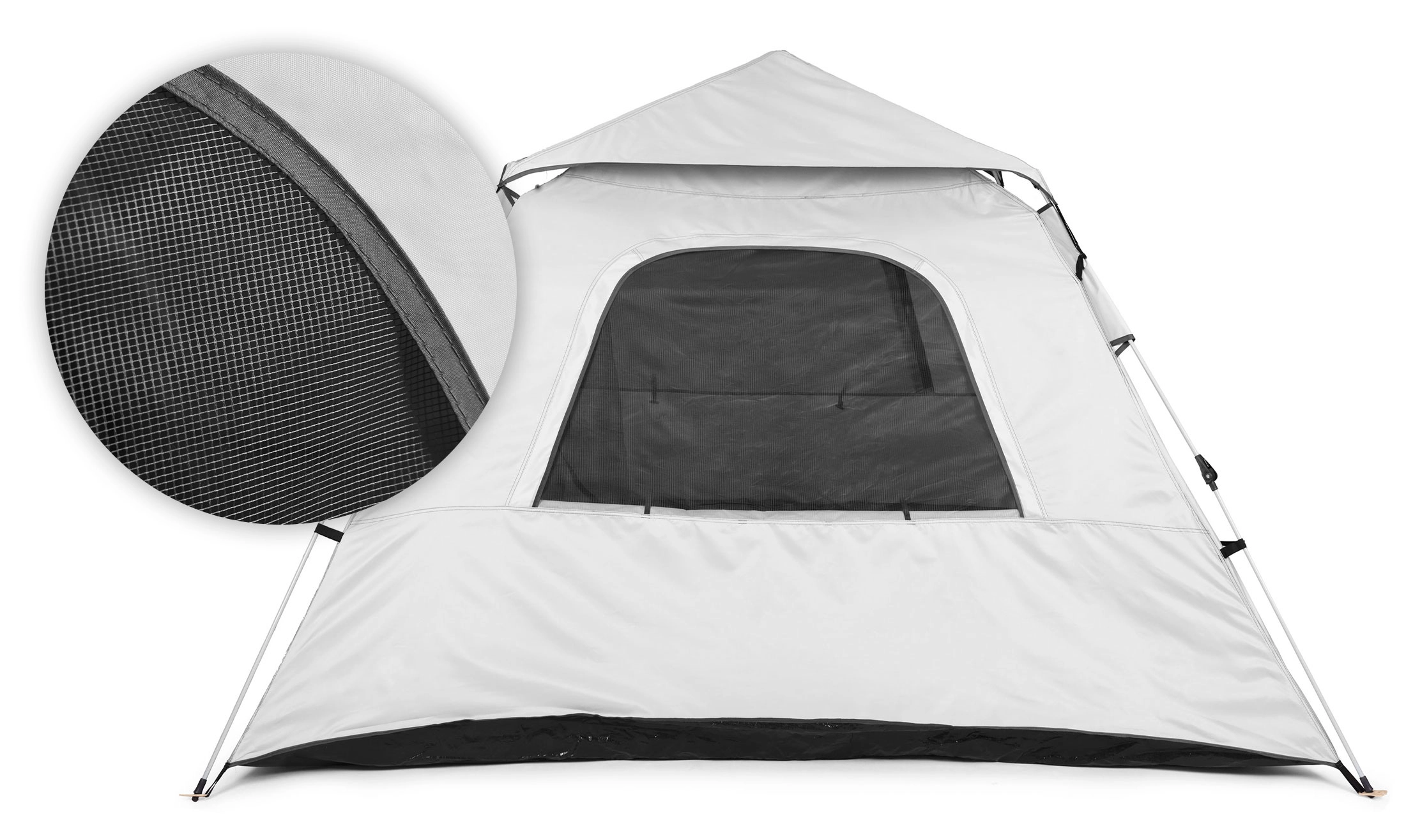 Okna in vrata šotora so opremljena z mrežami proti insektom, kar zagotavlja stalno cirkulacijo zraka in zaščito pred insekti, s čimer je v notranjosti šotora prijetno vzdušje tudi ob vročem vremenu. Material šotora je izdelan iz trpežnega poliestera s površinsko obdelavo PU, ki zagotavlja zaščito pred vlago in UV-sevanjem.