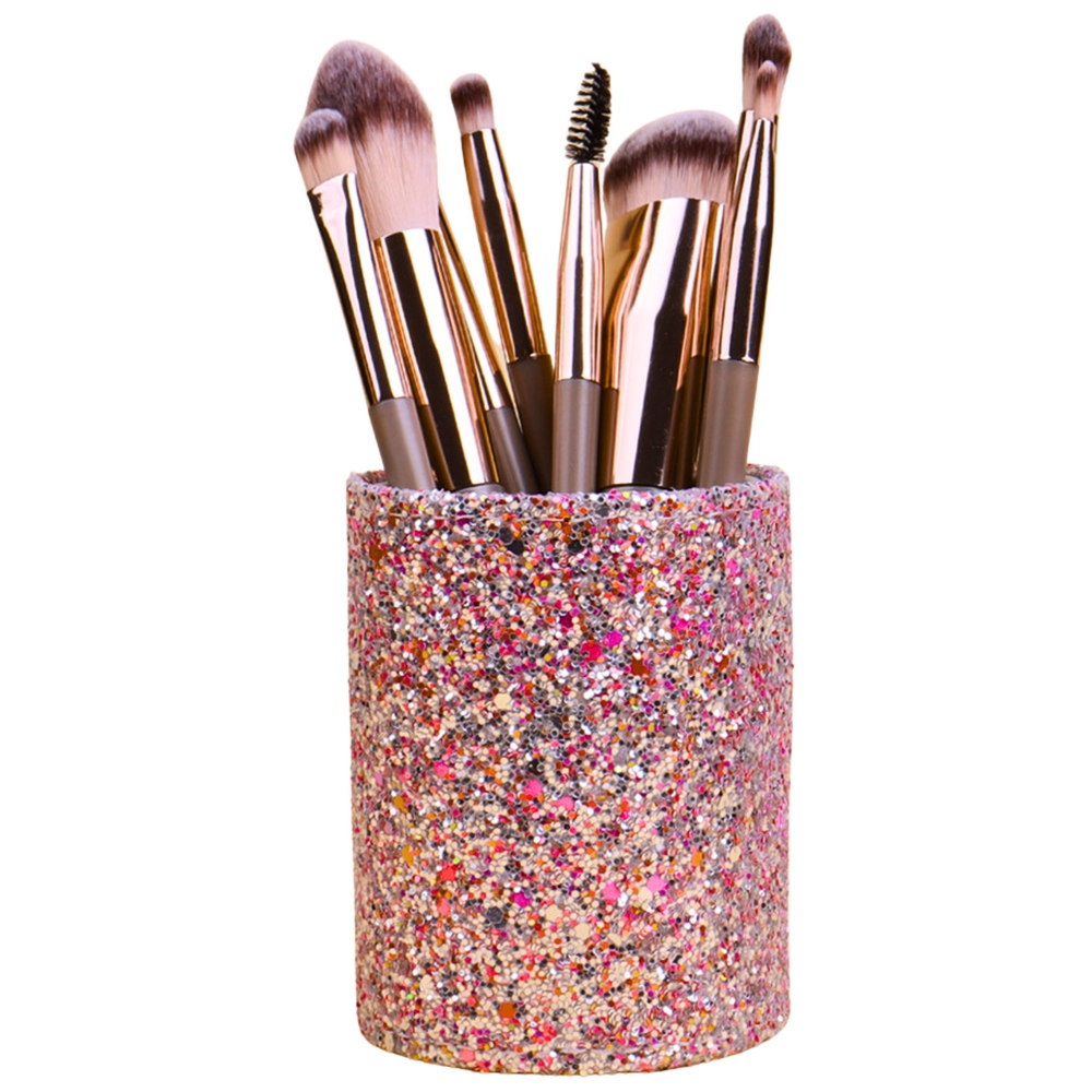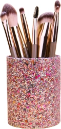 Izdelan iz odporne plastike in prekrit z bleščečim brokatom je ta lonček privlačna in elegantna rešitev. Idealen je za shranjevanje čopičev za ličila, svinčnikov za oči, maskar, kontur in drugih manjših kozmetičnih dodatkov.