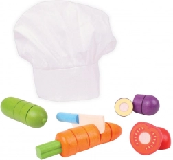 • Celovit set – leseni nož, zelenjava in tekstilna kuharska kapa.