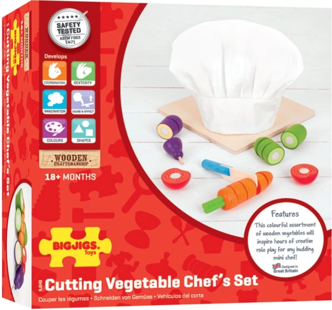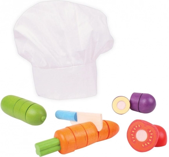 Ta kakovosten leseni komplet je odličen uvod v svet kuhanja. Otroci lahko zelenjavo “režejo” z lesenim nožem in jo znova povezujejo z ježkom, s čimer razvijajo koordinacijo oko–roka in fino motoriko. Priložena je tudi bela kuharska kapa za še več domišljijske igre.