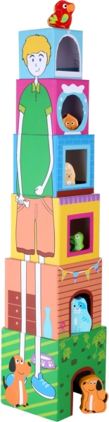 Ta čudovit sestavljivi stolp iz trpežnih kartonskih kock in lesenih živali uči otroke razvrščati velikosti, presojati prostor in uriti spretnost. Kocke postavite od največje do najmanjše v stabilen stolp visok do približno 58 cm, zahvaljujoč odprtinam v kockah pa vanje otroci vstavljajo ustrezne živali.