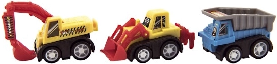 V pakiranju najdete različne tipe strojev, kot so bager, nakladač, buldožer ali prekucnik, ki skupaj ustvarjajo idealno osnovo za malo gradbišče. Zaradi kompaktnih mer so primerni za dom, vrtec in potovanja.