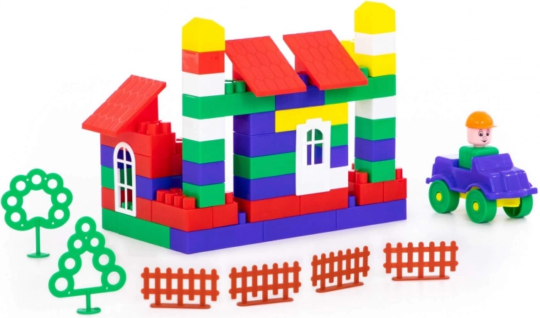 Vključuje različne oblike, kot so hiše, drevesa in ograje, ki jih lahko otroci sestavljajo po svoji domišljiji.