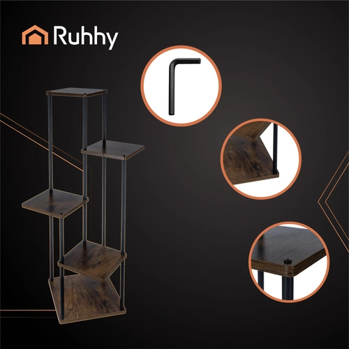 Stojalo za cvetje RUHHY prinaša funkcionalnost in stil v vaš dom. S svojimi 5 nivoji omogoča razporeditev prostora za rastline na majhnih površinah z modernim dizajnom, ki vključuje kovinsko konstrukcijo in lesene police. Soliden kovinski okvir prenese obremenitev do 75 kg, kar zagotavlja stabilnost in vzdržljivost stojala. Za zaščito tal je opremljeno z zaščitnimi nogicami, ki preprečujejo praske in omogočajo poravnavo stojala.