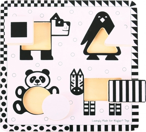 Črno-bele vstavljanke BIGJIGS TOYS so zasnovane posebej za najmlajše otroke. Kontrastna izvedba pomaga dojenčkom bolje izostriti vid in zaznavati oblike, medtem ko se štirje veliki leseni koščki z motivi živalic udobno vstavljajo v ustrezne odprtine.