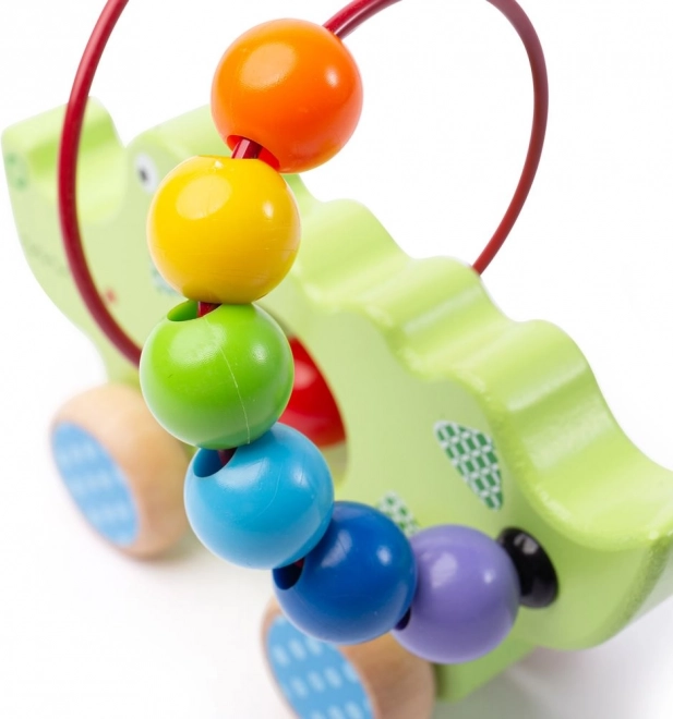 Leseni krokodil s krogličnim labirintom je idealna igrača za majhne raziskovalce. Njegova barvita zasnova pritegne pozornost otrok in jih uči koordinacijo gibov. Ta igrača je izdelana iz kakovostnih in varnih materialov, ki izpolnjujejo evropske varnostne standarde. Kroglični učinek koles omogoča, da se krokodil enostavno premika in otroci lahko igračo brez težav prestavljajo.