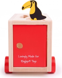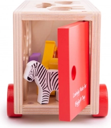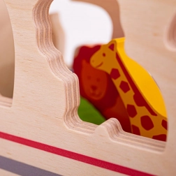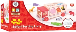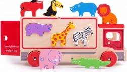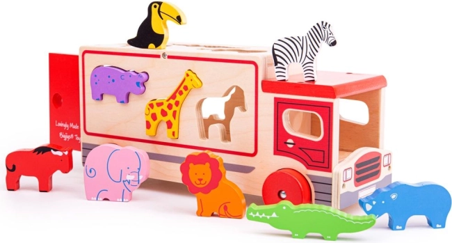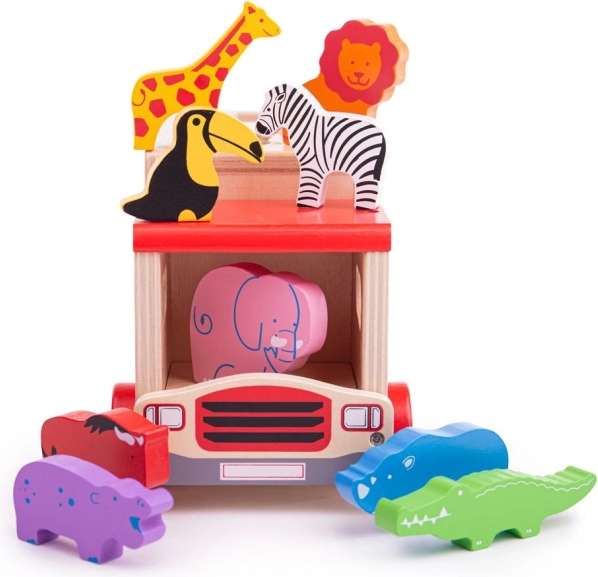 Ta pisano obarvana lesena igrača vsebuje prepoznavne živalske oblike, ki jih je mogoče naložiti na tovorno vozilo s posebnimi odprtinami na strehi in straneh vozila. Otroci lahko razvrščajo oblike in se učijo o različnih živalih, nato vsako žival vstavijo v pravilno odprtino. Ko so vse živali na svojem mestu, se zadnja vrata tovornjaka zaprejo in lahko se odpravijo na novo avanturo.