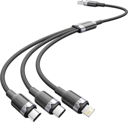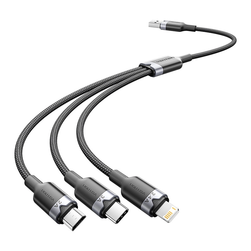 Uživajte v varnem in učinkovitem polnjenju z USB kablom, ki združuje tri različne priključke v enem praktičnem ohišju. Trpežna zasnova vključuje pocinjene bakrene vodnike, večslojno oklapljanje in pletenje iz bombaža ter PVC. Priključki so nikljani, aluminijasta ohišja pa zagotavljajo odpornost proti upogibanju.