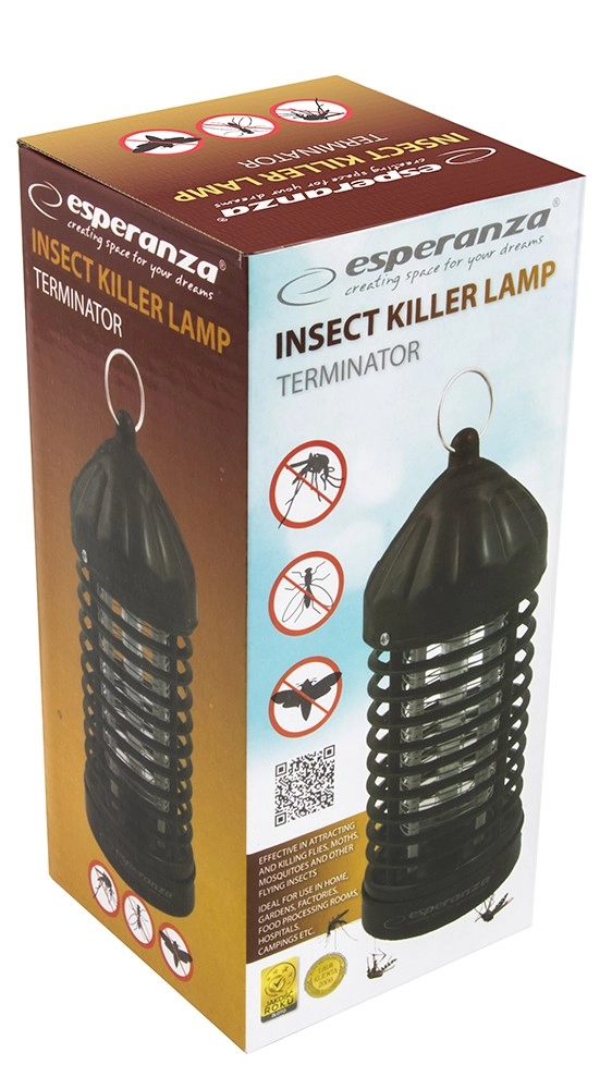 Svetilka za žuželke Esperanza Terminator učinkovito privlači muhe, vešče, komarje in druge leteče žuželke, da jih hitro eliminira. Brez uporabe kemikalij ali aerosolov in brez vonja.