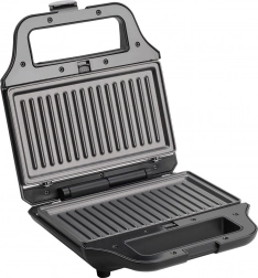 Opekač je opremljen z enostavno za vzdrževanje, nelepljivimi ploščami, ki jih po ohlajanju lahko namestite v pomivalni stroj ali obrišete z vlažno krpo. Varnost pri uporabi zagotavljajo kontrolna lučka segrevanja, samodejna regulacija temperature, hladno držalo in varnostna zapora plošč. Nedrseče nogice zagotavljajo stabilnost naprave.