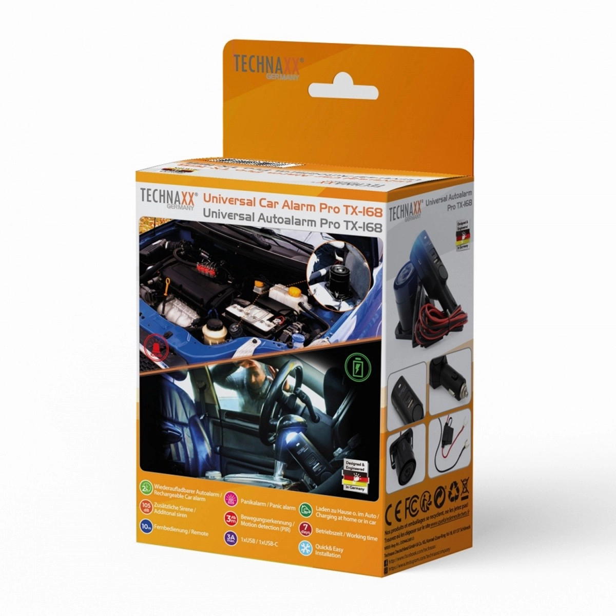 Univerzalni avtomobilski alarm omogoča enostavno priklopitev v standardni avtomobilski vžigalnik DC12 ali 24V, kar omogoča hitro in prilagodljivo namestitev. Vsebuje zunanjo sireno, ki se preprosto namesti v motornem prostoru, in zagotavlja alarm z glasnostjo okoli 105 dB.