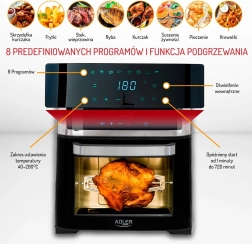 Začnite pripravljati bolj zdrave jedi s cvrtnikom ADLER AD 6309, ki uporablja konvekcijsko tehnologijo za pripravo hrane brez olja. Moč do 2500 W zagotavlja, da bodo vaši kosi mesa hrustljavi in sočni. Temperaturno območje od 40 do 200°C omogoča pečenje, pogrevanje in ohranjanje toplote.