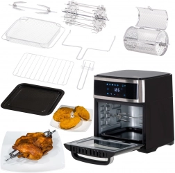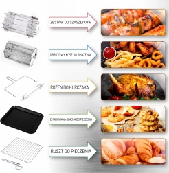 Cvrtnik ponuja osem različnih programov za različne vrste jedi, kot so piščančja krilca, ribe, kozice, zrezki in drugo. V paketu so tudi druge uporabne pripomočke, kot so raženj za piščanca, pekač ali koš za cvrtnik. Vse komponente so izdelane iz trpežnih materialov in primerne za pomivanje v pomivalnem stroju.
