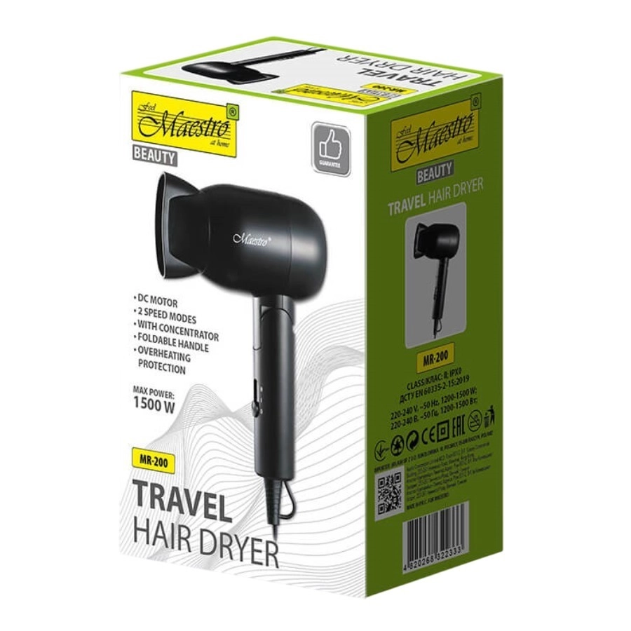 Če iščete praktičen, zanesljiv in kompakten potovalni sušilnik za lase, je Maestro MR-200 odlična izbira!