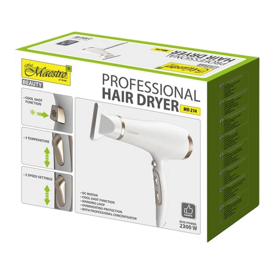 Sušilnik je opremljen s koncentratorjem za natančno usmerjanje zračnega toka, kar olajša precizno oblikovanje. Ponuja 2 hitrosti pihanja in 3 nastavitve temperature, ki omogočajo prilagoditev delovanja vašim individualnim potrebam in tipu las.
