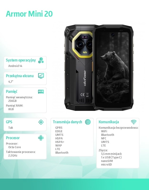 Doživite vzdržljivost s telefonom Ulefone Armor 20, ki združuje robusten dizajn z visoko kapaciteto shrambe. Ta telefon je idealen spremljevalec za vse, ki potrebujejo zanesljivo napravo v zahtevnih pogojih.
