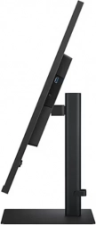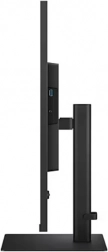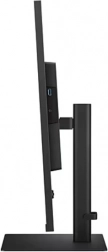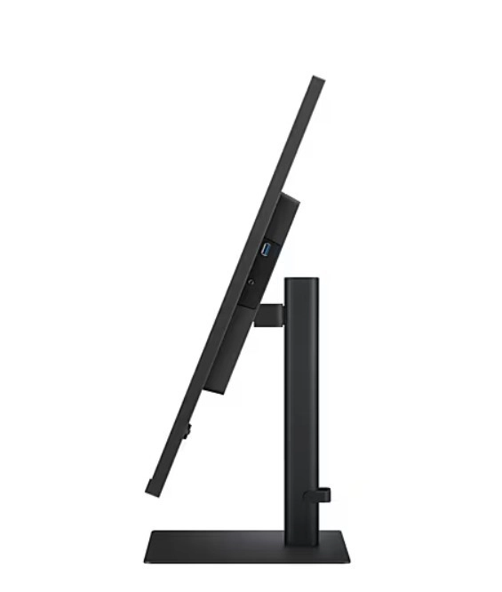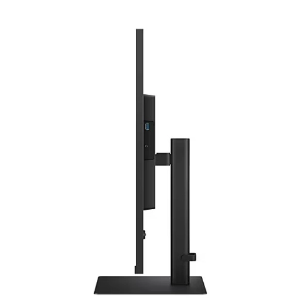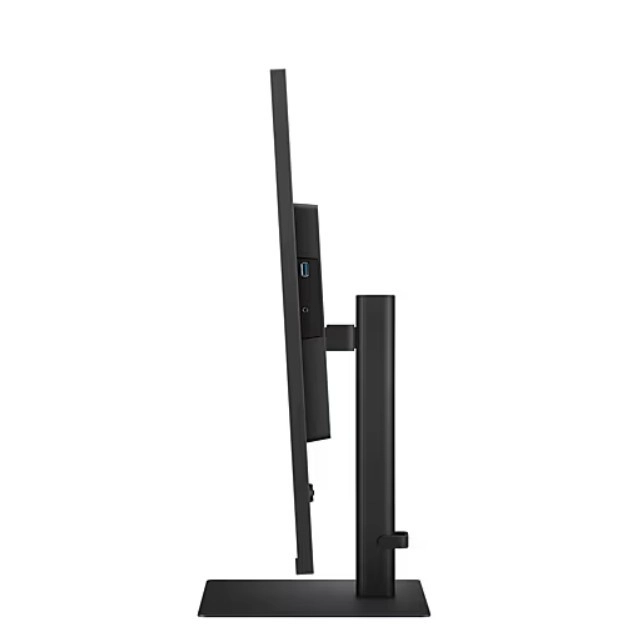 Stranski pogled na monitor razkriva njegov tanek profil. Stojalo omogoča nastavitev višine in nagiba, kar zagotavlja ergonomsko udobje.