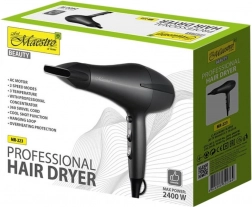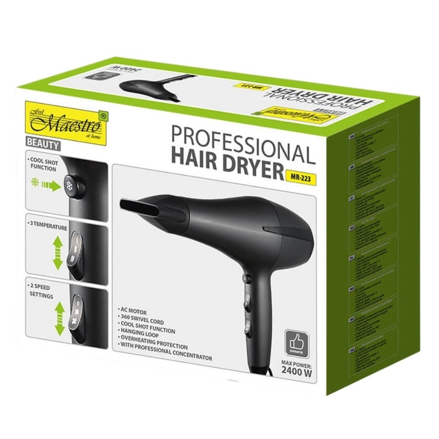 Sušilnik za lase Maestro 2400W je zasnovan tako, da izpolni vaše vsakodnevne potrebe pri negi las. S tem aparatom boste dobili močan in stabilen zračni tok, ki se spopade z vsako dolžino in gostoto las.