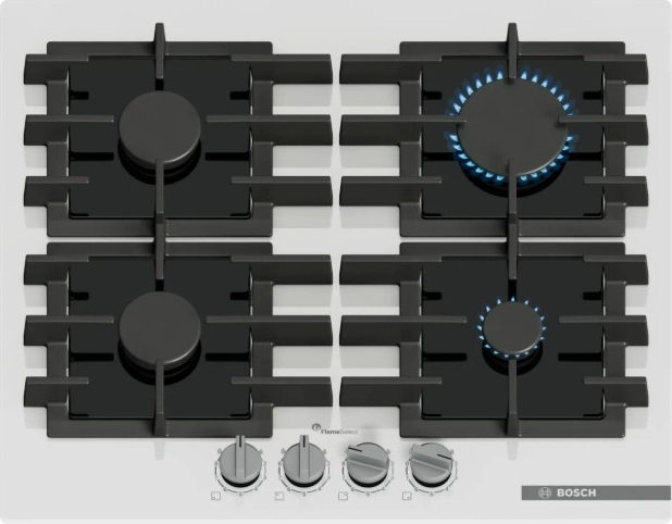 Popoln nadzor nad plinsko kuhalno ploščo. S kuhalno ploščo Bosch FlameSelect lahko enostavno in natančno uravnavate intenzivnost plamena, kar zagotavlja popolne rezultate kuhanja. Na voljo je devet stopenj plamena, idealnih za cvrtje, dušenje in kuhanje.