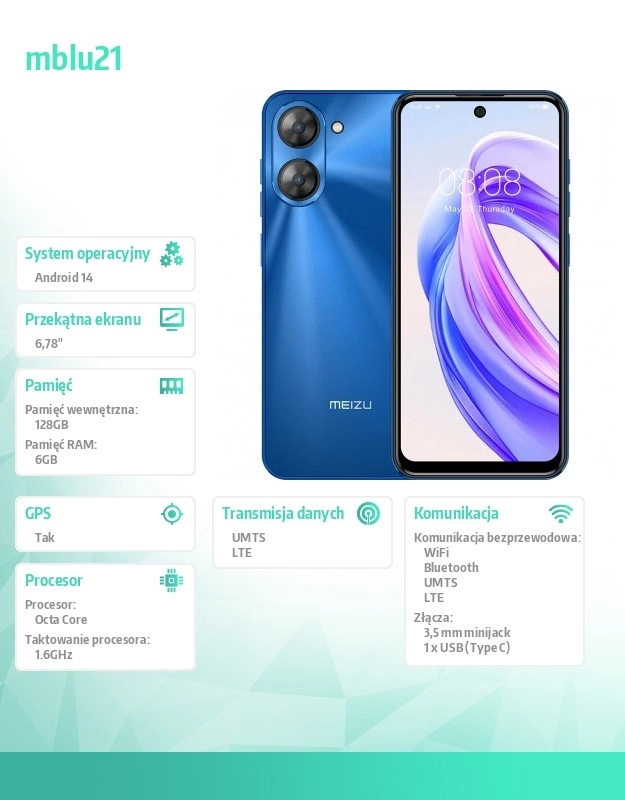 Glavni 13 MP fotoaparat s petlečnim objektivom ujame vsak detajl, medtem ko je 8 MP sprednja kamera vaš partner za selfije in video klice. MEIZU je opremljen z najnovejšim operacijskim sistemom Android 14 in širokimi možnostmi povezljivosti, vključno z Wi‑Fi, Bluetooth 5.0 in USB Type‑C.