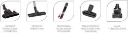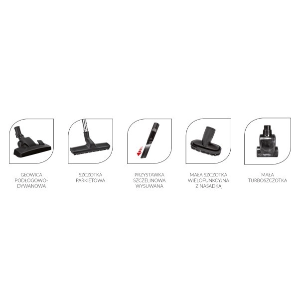 Oprema sesalnika: V kompletu boste našli talno in preprožno glavo, krtačo za parket, mali turbo krtačo, izvlečno ozko šobo in majhno večnamensko krtačo s nastavkom.