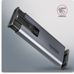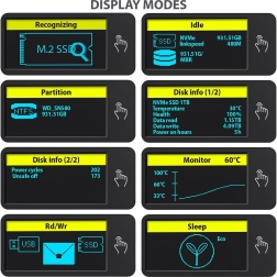 Zunanje ohišje AXAGON je opremljeno z naprednim LED-zaslonom, ki nudi takojšen pregled nad stanjem diska. Zaslon prikazuje informacije, kot so zaznava diska, datotečni sistem, temperatura, stanje diska, hitrost prenosa podatkov in skupni čas delovanja. Z nadzorom temperature v realnem času in varčnim načinom imate popoln nadzor nad stanjem vašega diska.