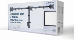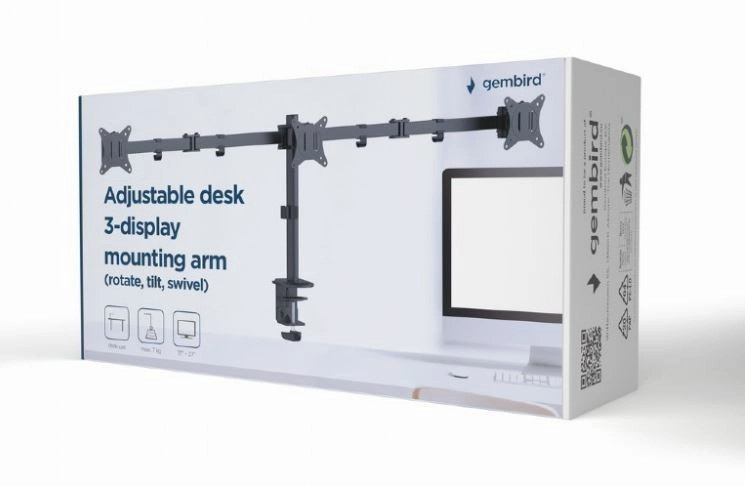 Svoje monitorje udobno nastavite z nastavljivim namiznim nosilcem za tri monitorje, ki podpira monitorje velikosti od 17 do 27 palcev in teže do 7 kg.