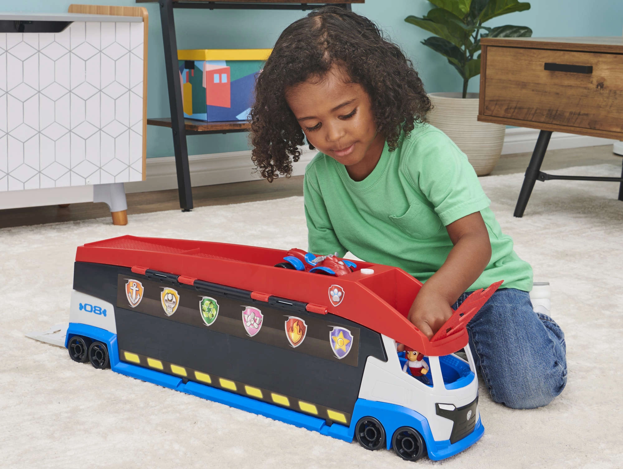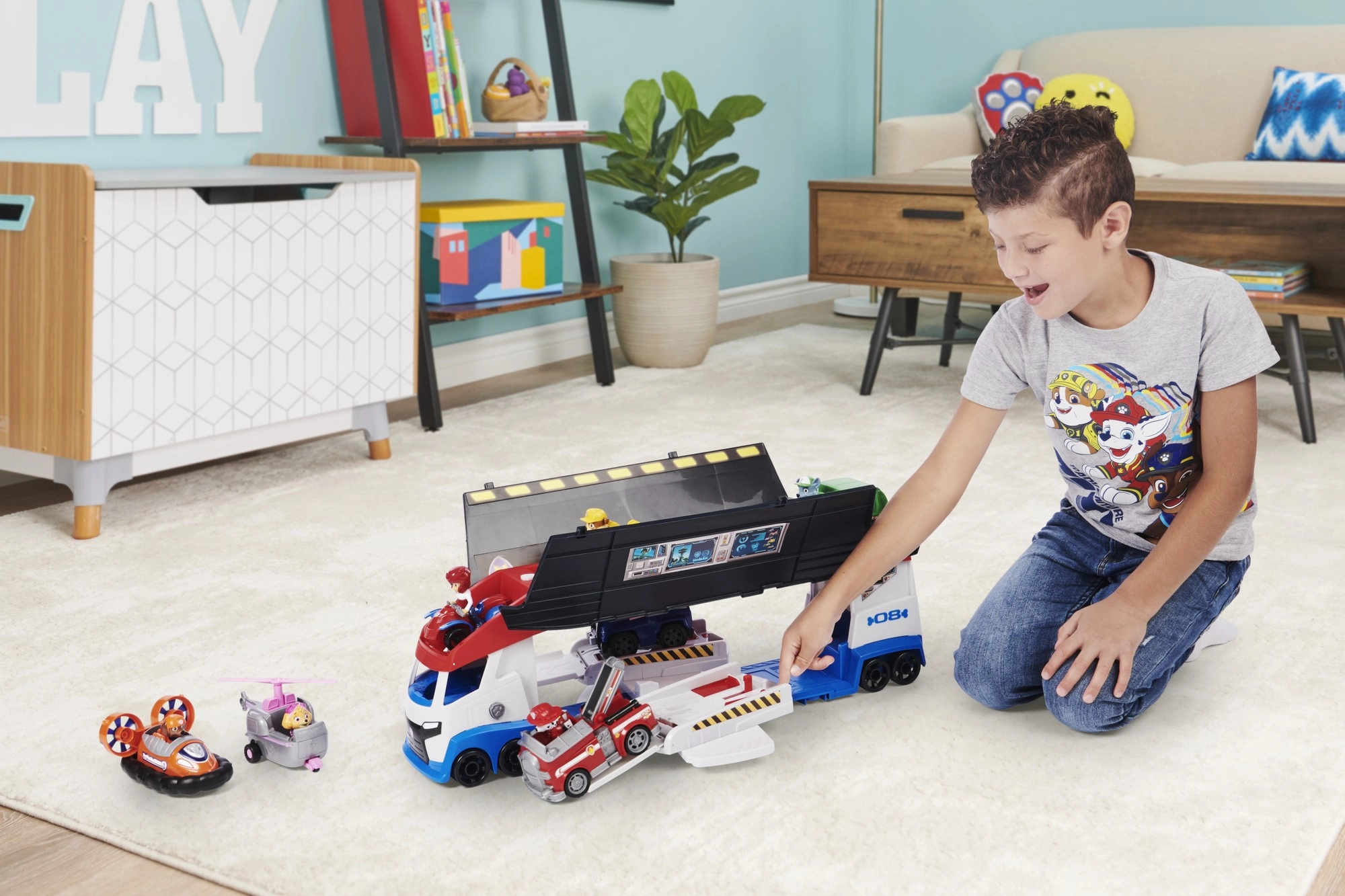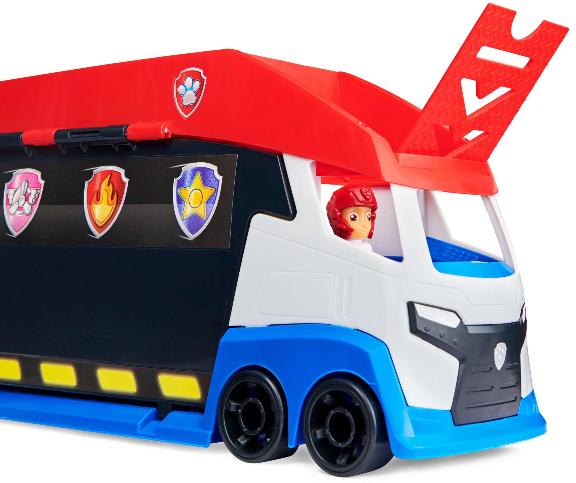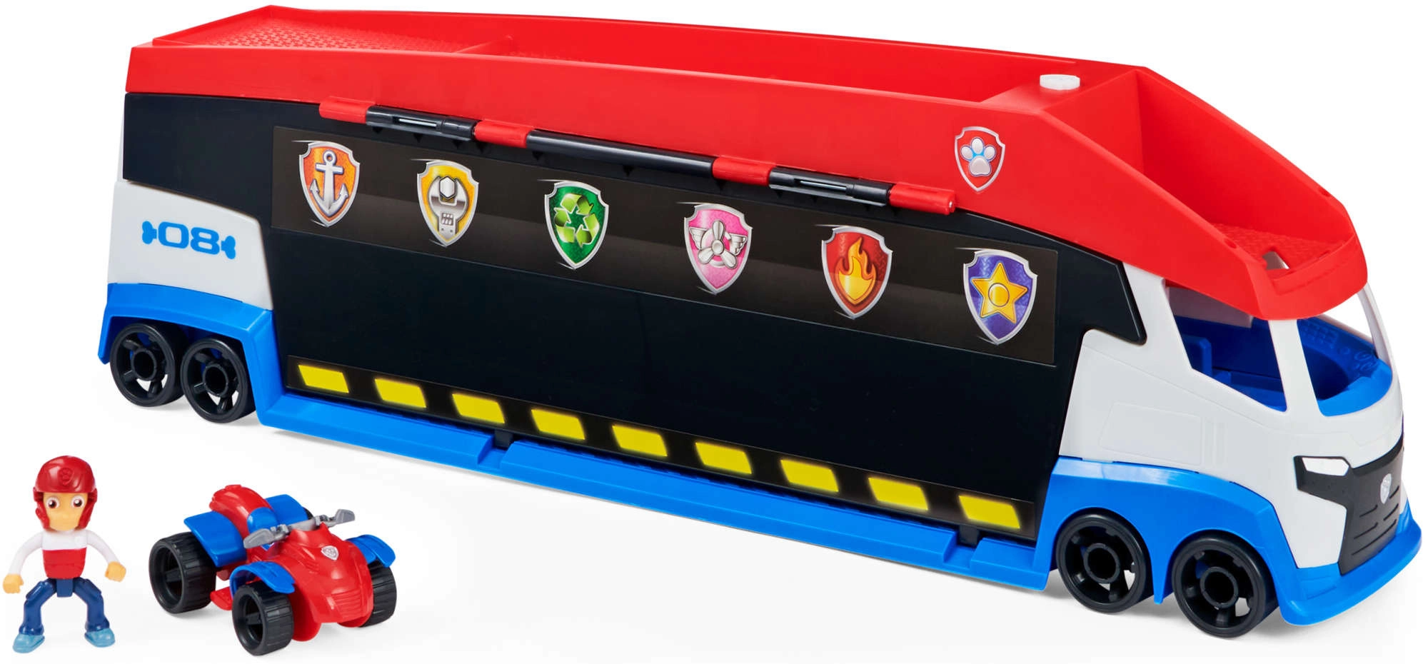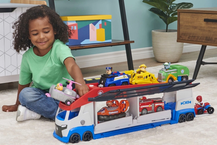 Ogromen transporter, navdihnjen s priljubljeno serijo PAW PATROL, bo razveselil vse male reševalce. Zaradi preklopnih stranskih panelov in ramp se iz kabine tovornjaka spremeni v mobilni servis in poveljstvo. S pritiskom na gumb z odtisom tačke se sprožijo realistični zvoki motorja, hupa in vzvratne vožnje, ki še poudarijo vzdušje igre.