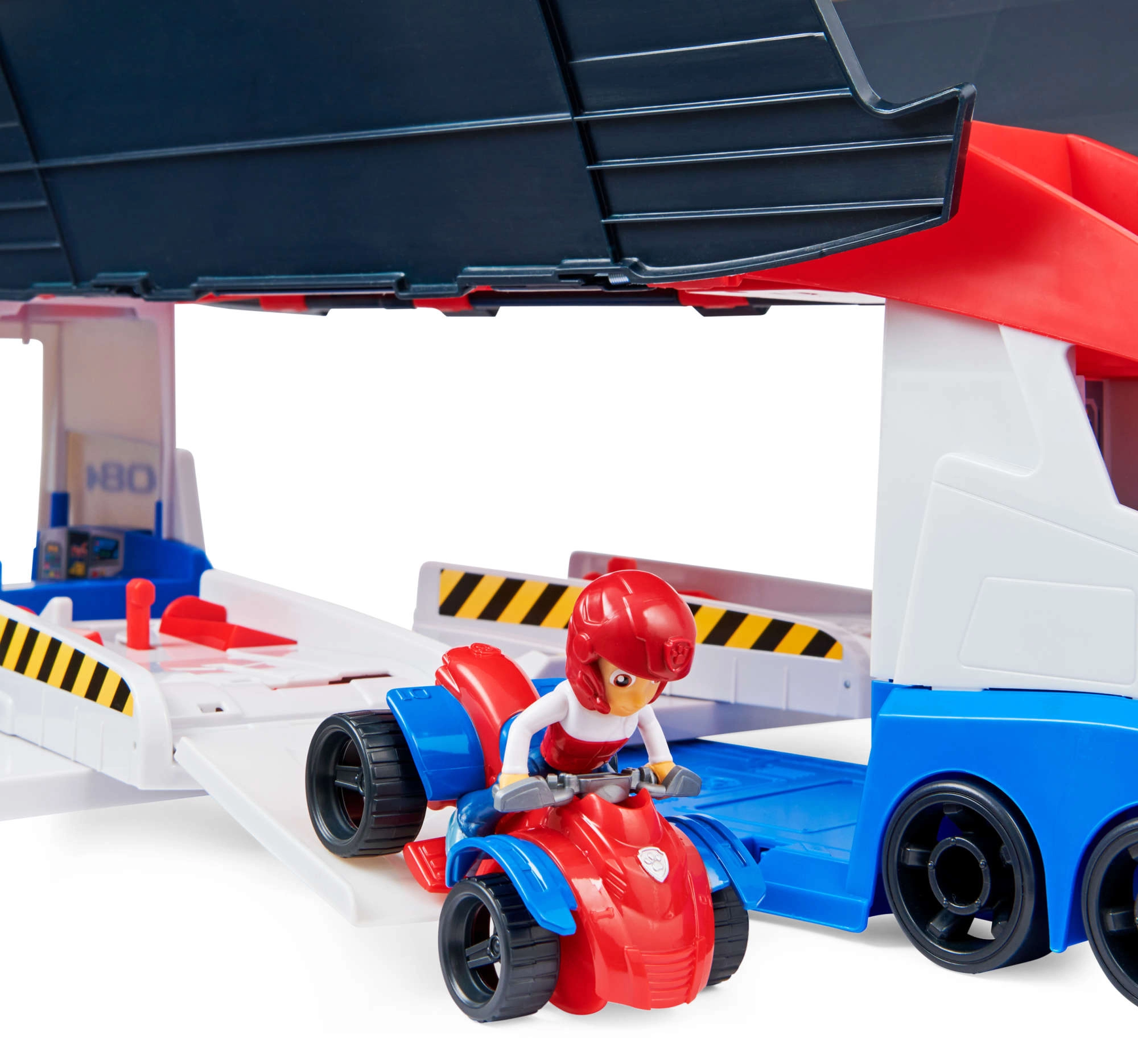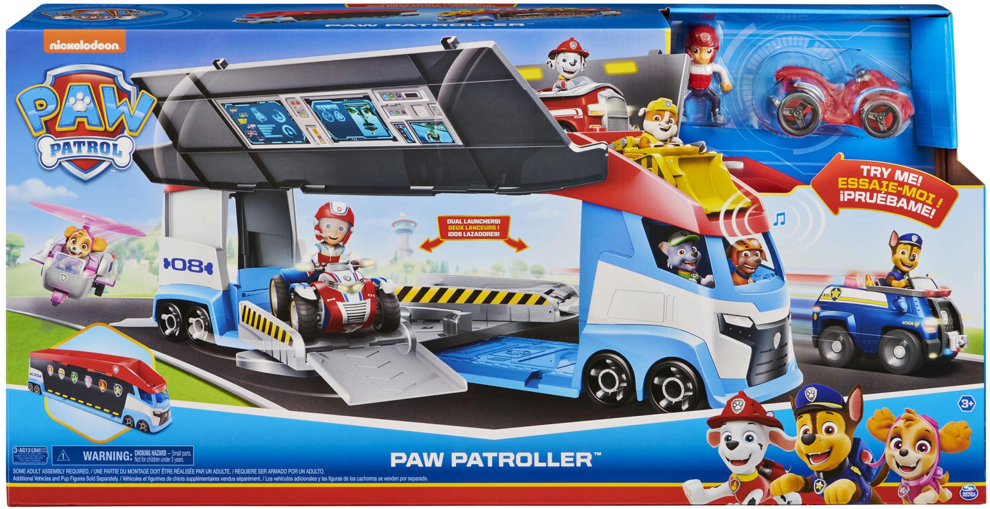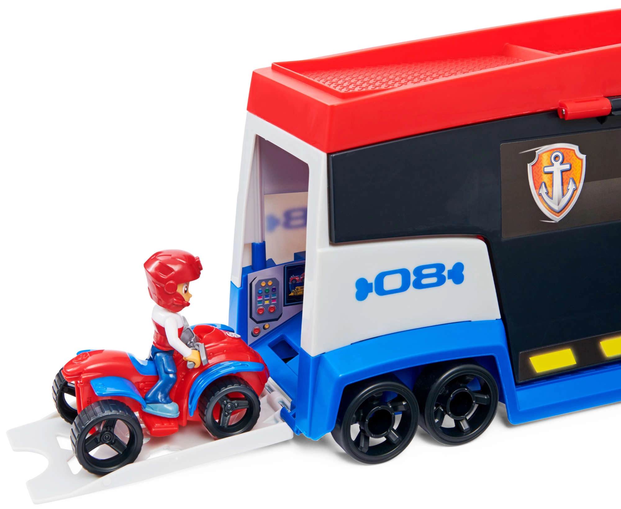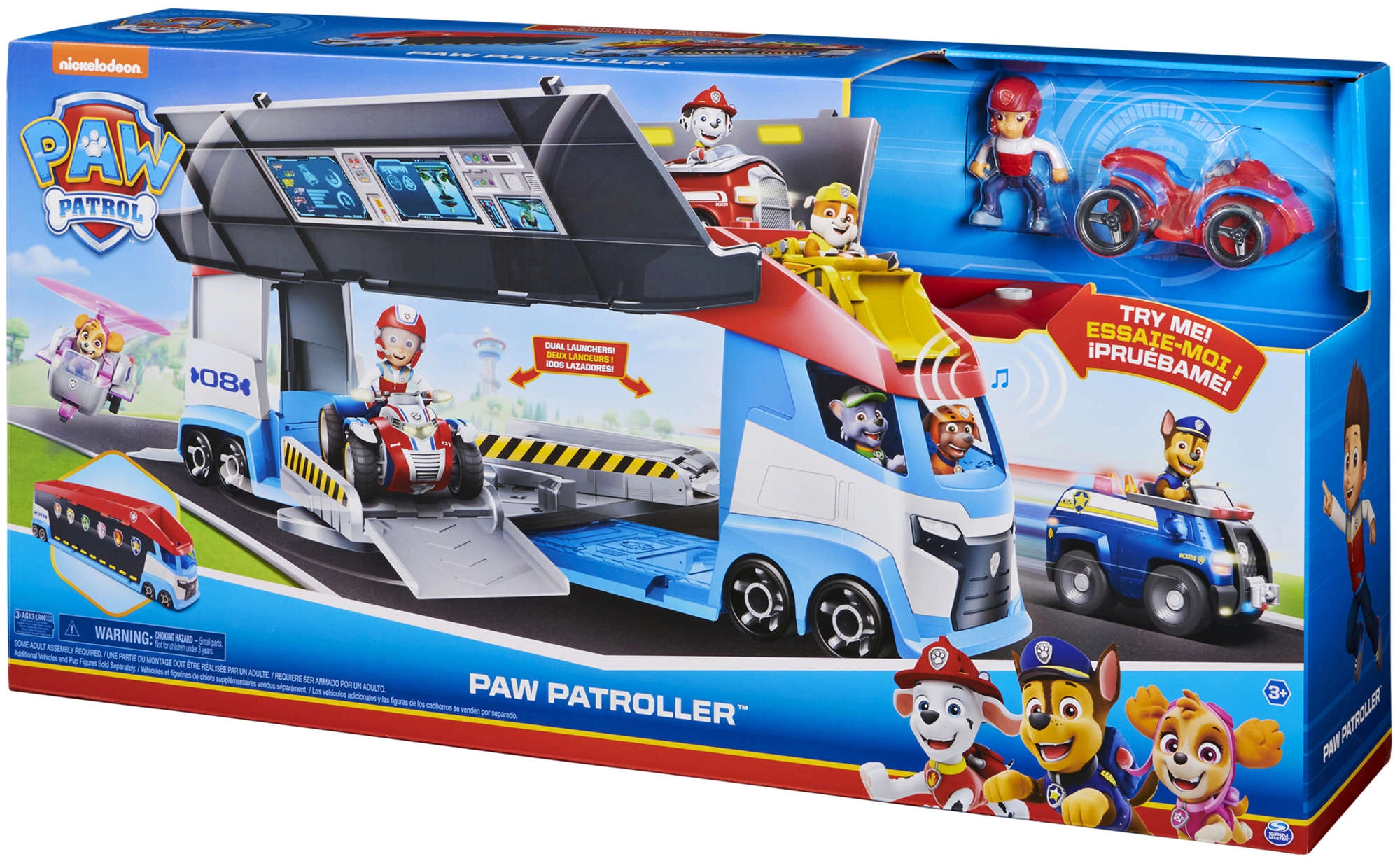 Patruljnik zlahka prepelje do 6 vozil (združljiv s standardnimi vozili PAW PATROL), ima 2 izstreljevalnika za hiter začetek akcije in dvižna stranska vrata za gladko zapeljevanje. Z priloženo figurico Ryderja in njegovim štirikolesnikom se otroci lahko takoj podajo na misijo.