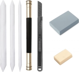 Vsebuje 27 ročno izbranih pripomočkov, vključno s svinčniki, ogljem in drugimi orodji, potrebnimi za skiciranje.