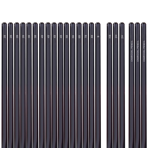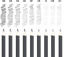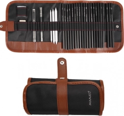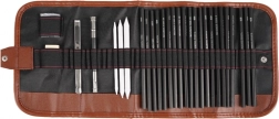 V specifikaciji najdete: 18 risalnih svinčnikov z različnimi trdotami, 3 ogljene svinčnike, podaljšek za svinčnik, 3 papirnate mečkalke za senčenje, radirko, papirnati nožek in eleganten črn etui.
