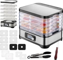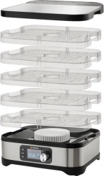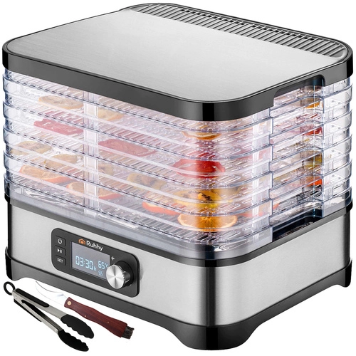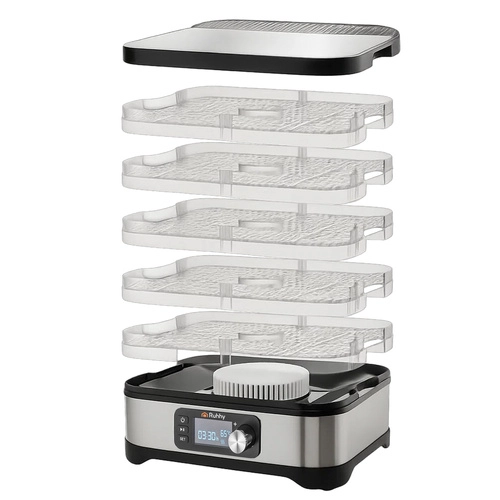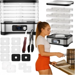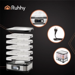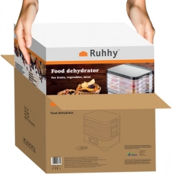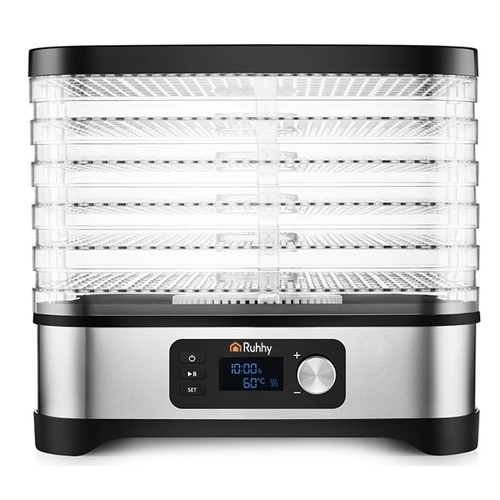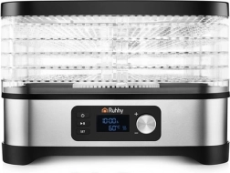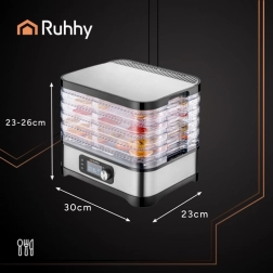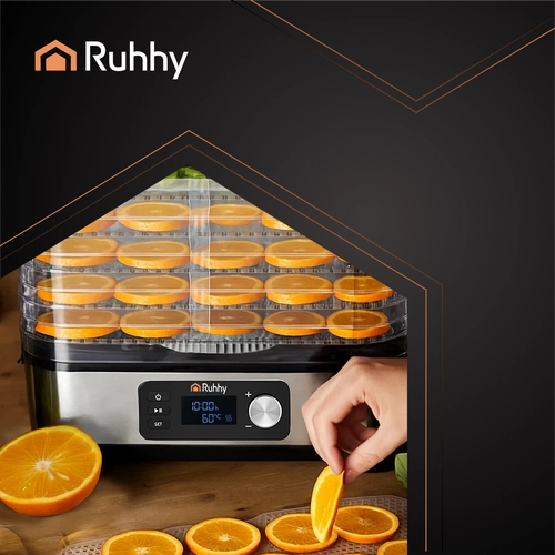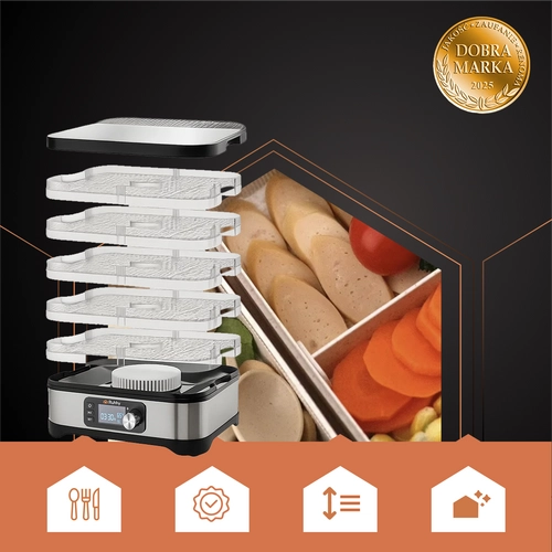 Sušilnik RUHHY izstopa po svoji univerzalni uporabi - idealen je za sušenje gob, sadja, zelenjave in zelišč. Opremljen je s 5 pladnji za maksimalen prostor za sušenje in nastavljivo temperaturo od 35 do 70°C, da se prilagodi različnim vrstam živil.