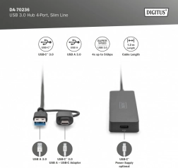Vozlišče USB 3.0 s 4 vrati SlimLine z USB-C adapterjem 1,2m 5Gbps, napajalni priklop USB-C