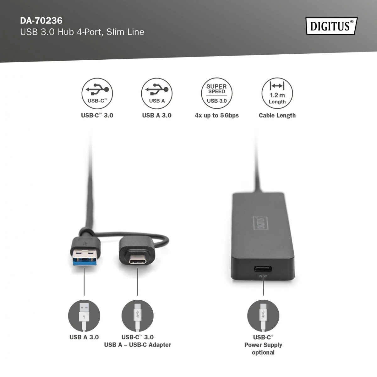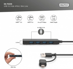 Vozlišče USB 3.0 DIGITUS Slim Line je idealna rešitev za povečanje povezljivosti na delovnem mestu ali doma. Kompaktna zasnova in 1,2-metrski kabel omogočata prilagoditev dolžine povezave do prenosnika ali delovne postaje.