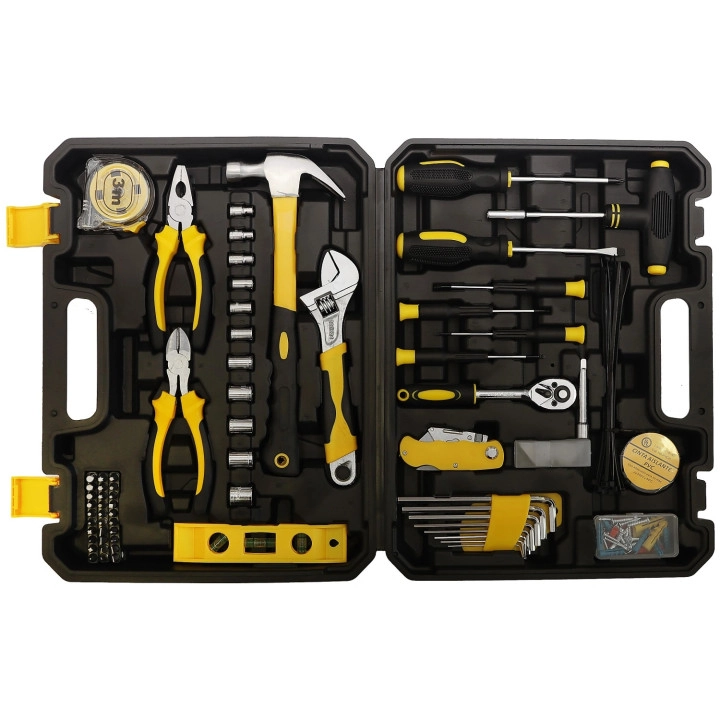 Ta set vsebuje vse potrebno za vsakdanje naloge, kot so sestavljanje pohištva, popravilo kolesa, zamenjava vtičnice ali obešanje slik. Shranjevanje v trdnem kovčku z oblikovanimi predelki zagotavlja enostavno organizacijo in varno prenašanje. Orodja iz ogljikovega in krom-vanadijevega jekla nudijo dolgo življenjsko dobo in zanesljivost več let.