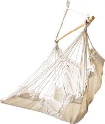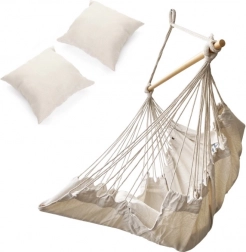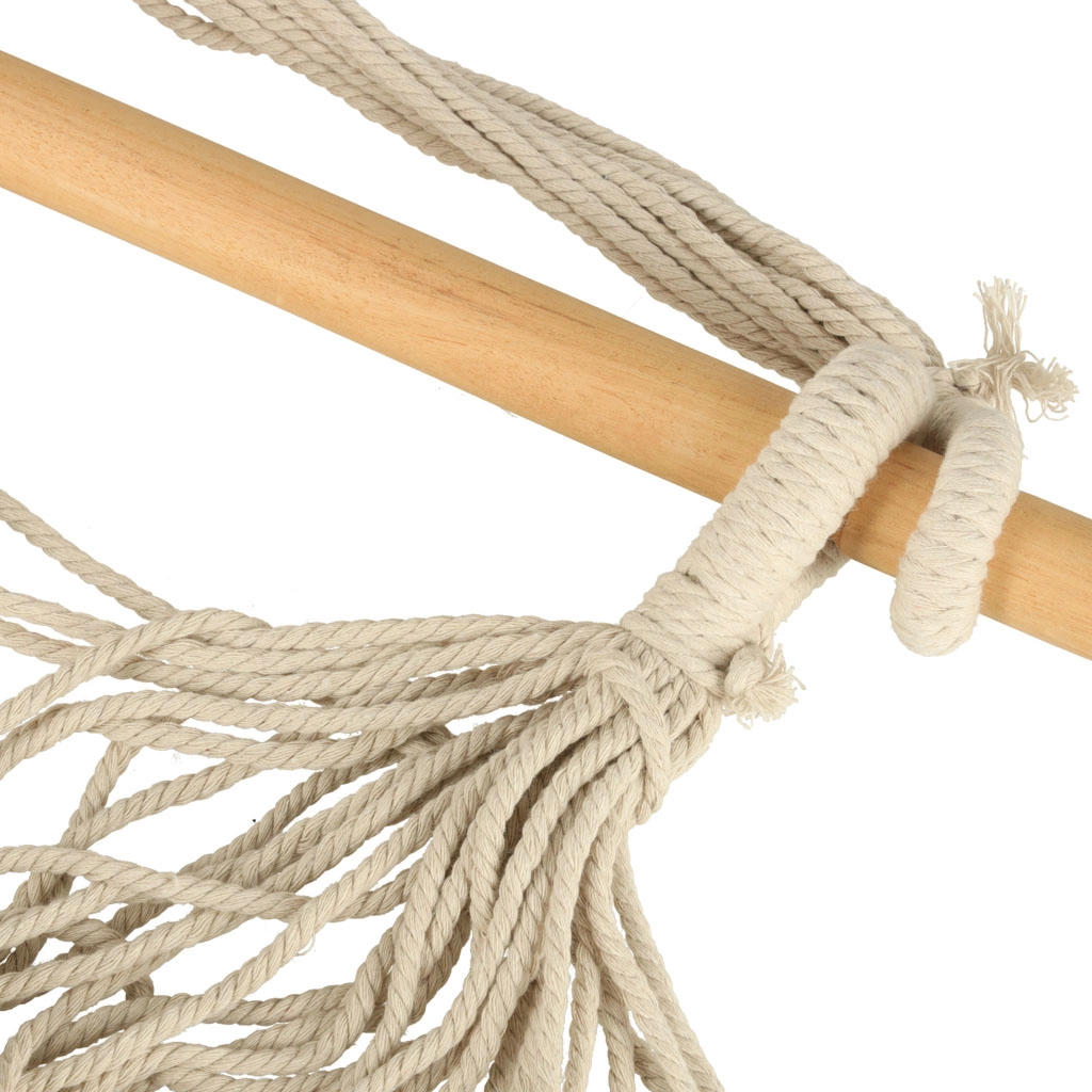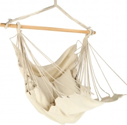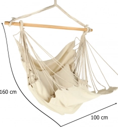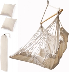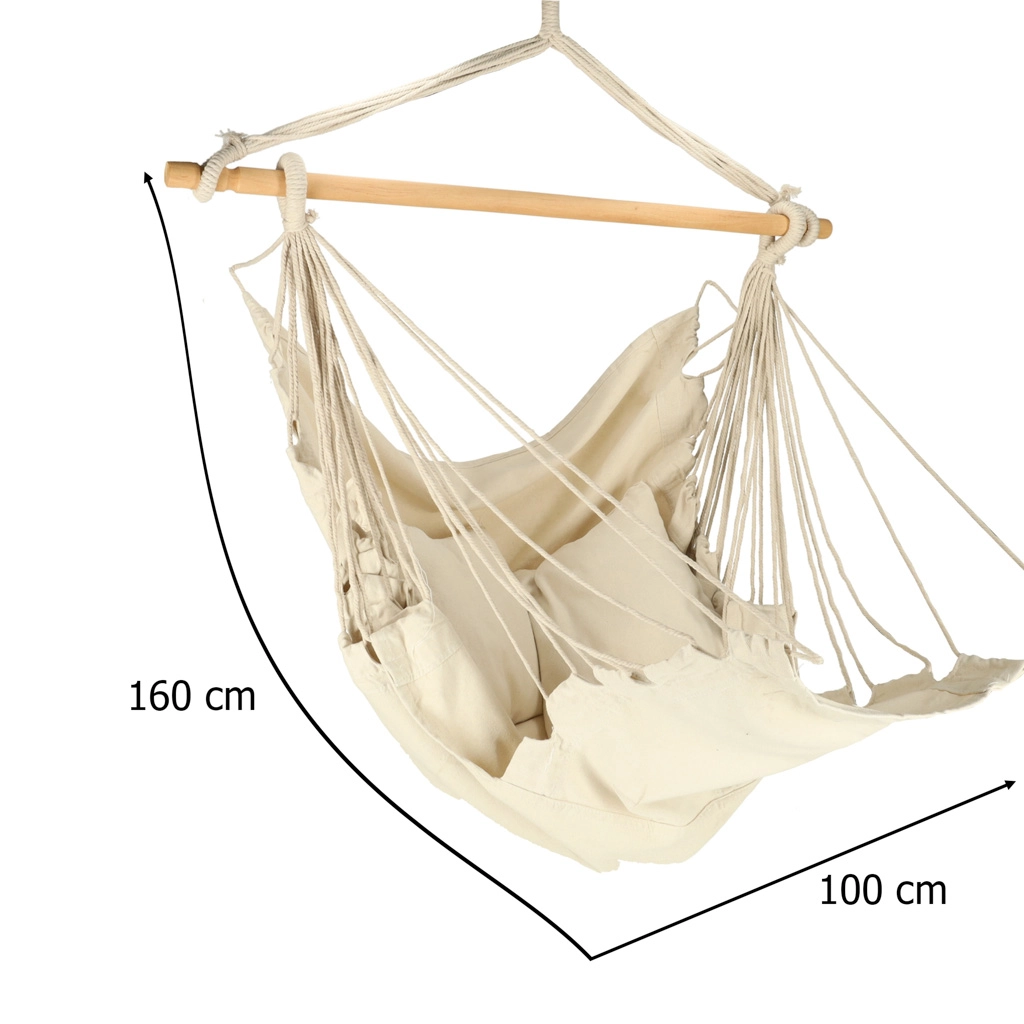 Ta viseči pohištveni element se prilega boho dizajnu ter ga je mogoče postaviti na vrtu ali vikendu. Material je prijeten na dotik ter pomaga pri sprostitvi stresa. Paket vključuje stol, leseno palico, viseče vrvice in dva udobna blazina. Dodajte košček miru in udobja v svoje življenje.