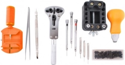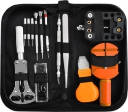 Vključuje različne izvijače, odstranjevalec zatičev, pinceto, nož za pritrdilne elemente in drugo opremo za natančne popravke ur.